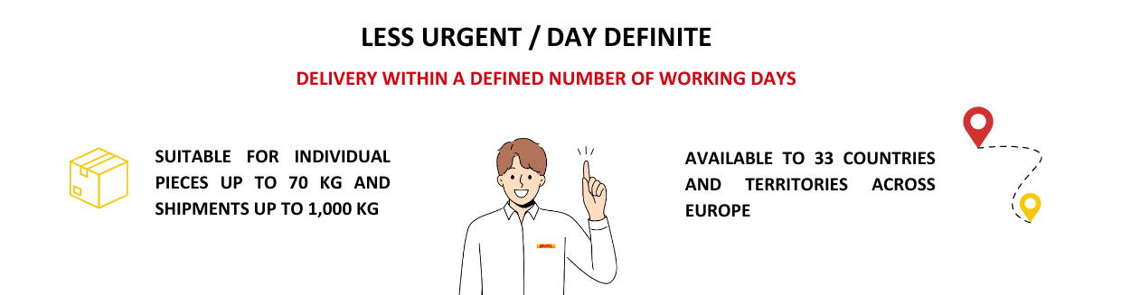 DHL ECONOMY SELECT is the ideal choice for less urgent shipments, providing door-to-door delivery in 33 countries across Europe within a defined number of business days. With daily ground transit available, you can save on your less urgent shipments without sacrificing reliability.
